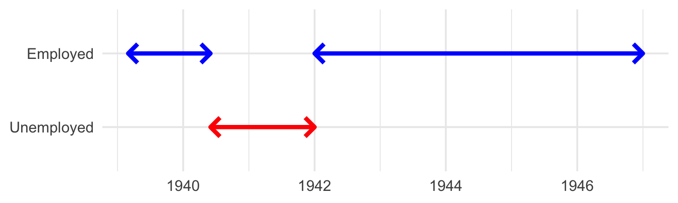 # Extract the start and end of each of Bruce's employment spansstarts <-int_start(bruce_employment_intervals)ends <-int_end(bruce_employment_intervals)# Turn the ends of employment into the starts of unemploymentbruce_unemployment_intervals <-interval(ends[-length(ends)], starts[-1])print(bruce_unemployment_intervals)