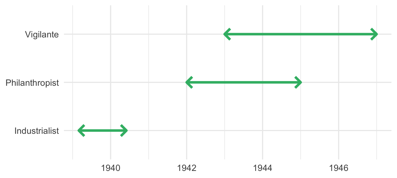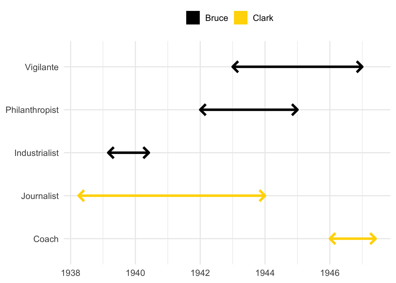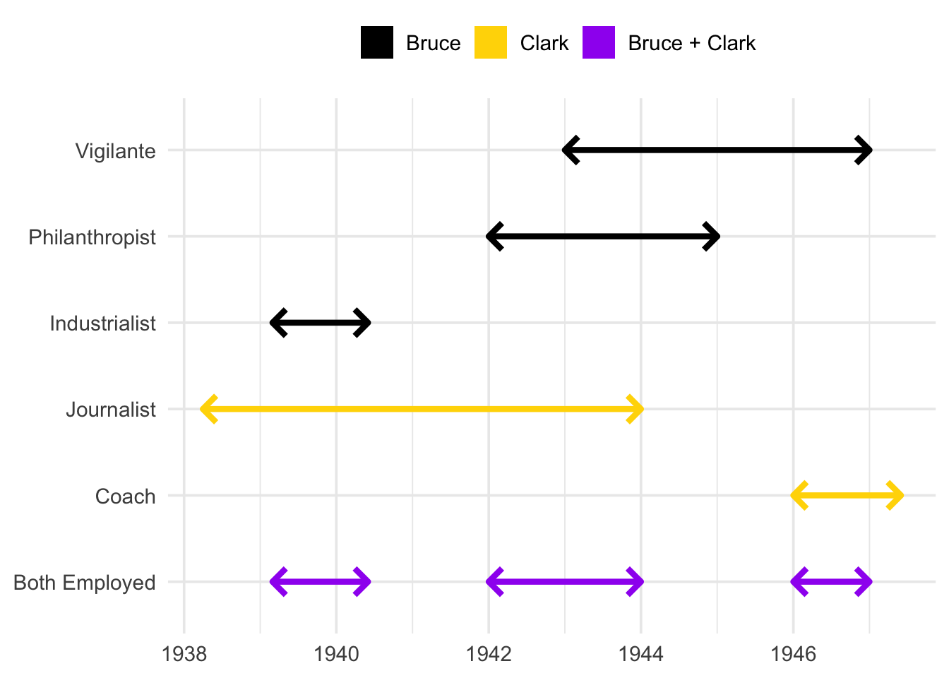 We present this plot to our boss. They look at us, perplexed, and ask why it took 30 minutes to make this one image. Anyhow, they grumble, for our next task we need to find all periods where Bruce and Clark were working at the same time.